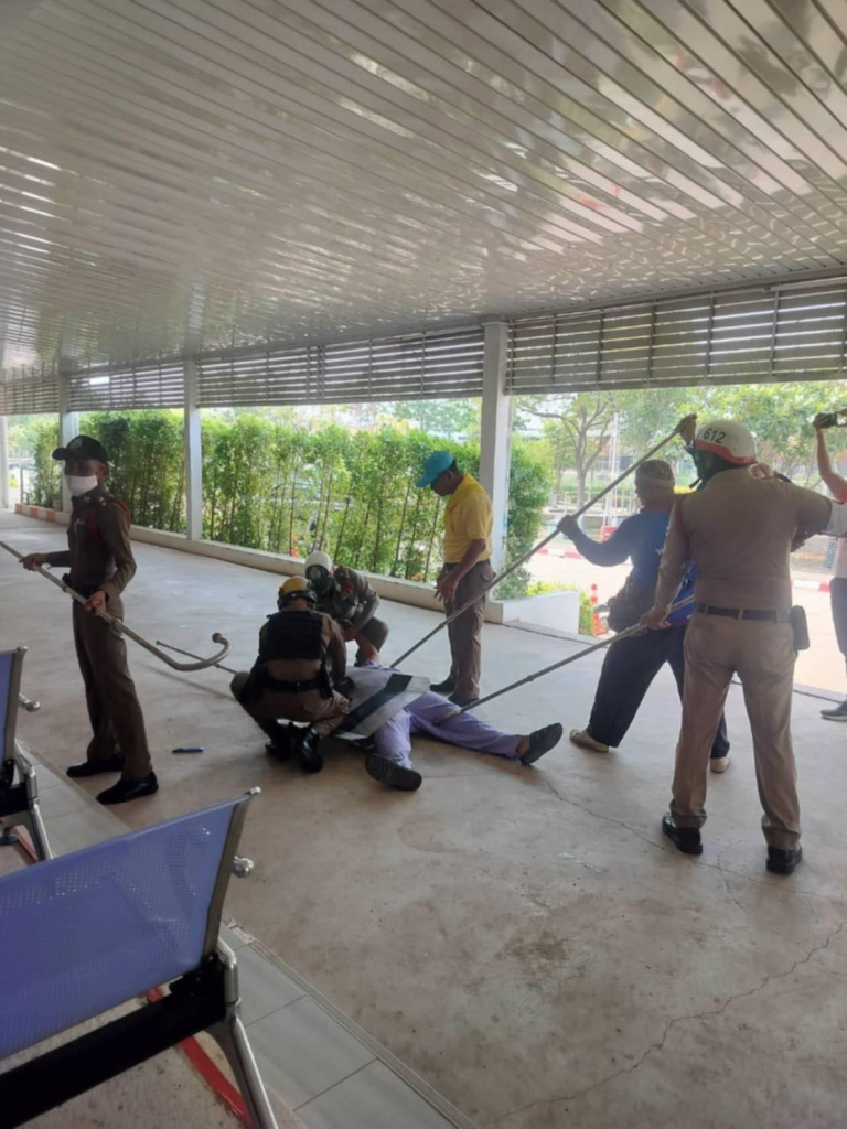 สภ.พระทองคำ โดยการรำของ พ.ต.อ.อิทธิพัทธิ์ ศรีมั่น ผกก.สภ.พระทองคำ ร่วมกับนายสุวีระศักดิ์ ริ้วรอด ผู้อำนวยการโรงพยาบาลพระทองคำเฉลิมพระเกียรติ 80 พรรษาโดยทำการซ้อมแผนเผชิญเหตุควบคุมคนวิกลจริตโดยใช้ไม้ง่าม ที่โรงพยาบาลเฉลิมพระเกียรติ 80 พรรษา เพื่อ ให้เจ้าหน้าที่และผู้ที่มีส่วนเกี่ยวข้องทราบถึงบทบาทหน้าที่ในการปฏิบัติงานเมื่อเกิดสถานการณ์จริง