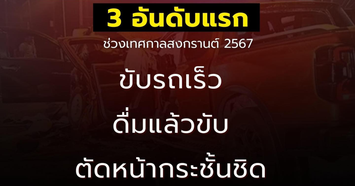 สาเหตุการเกิดอุบัติเหตุบนท้องถนน 3 อันดับแรก เกิดจาก ขับรถเร็ว เมาแล้วขับ และตัดหน้ากระชั้นชิด