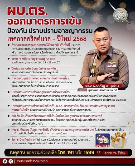 พล.ต.อ.กิตติ์รัฐ พันธุ์เพ็ชร์ ผู้บัญชาการตำรวจแห่งชาติ สั่งการตำรวจทั่วประเทศ กำชับป้องกัน ปราบปรามอาชญากรรม เทศกาลคริสต์มาส – ปีใหม่ 2568 ![]()